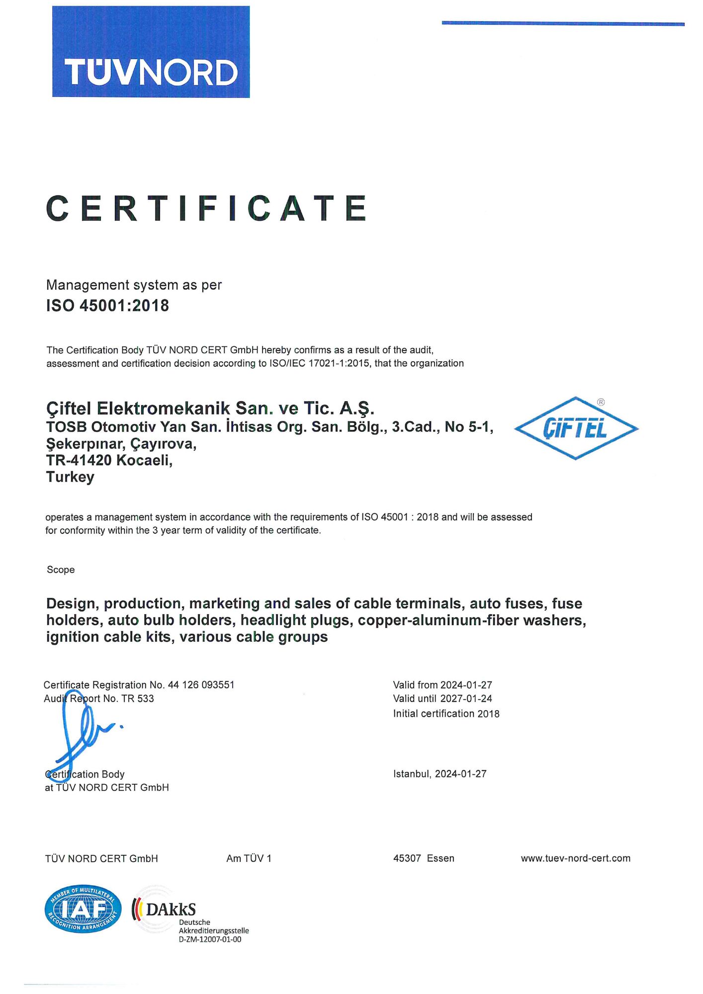 ÇİFTEL has always updated its quality management systems by constantly following the developments and established an integrated management system and obtained IATF 16949:2016, ISO 9001:2015, ISO 14001:2015 and ISO 45001:2018 Certificates. ELV and RoHS certificates are also available.